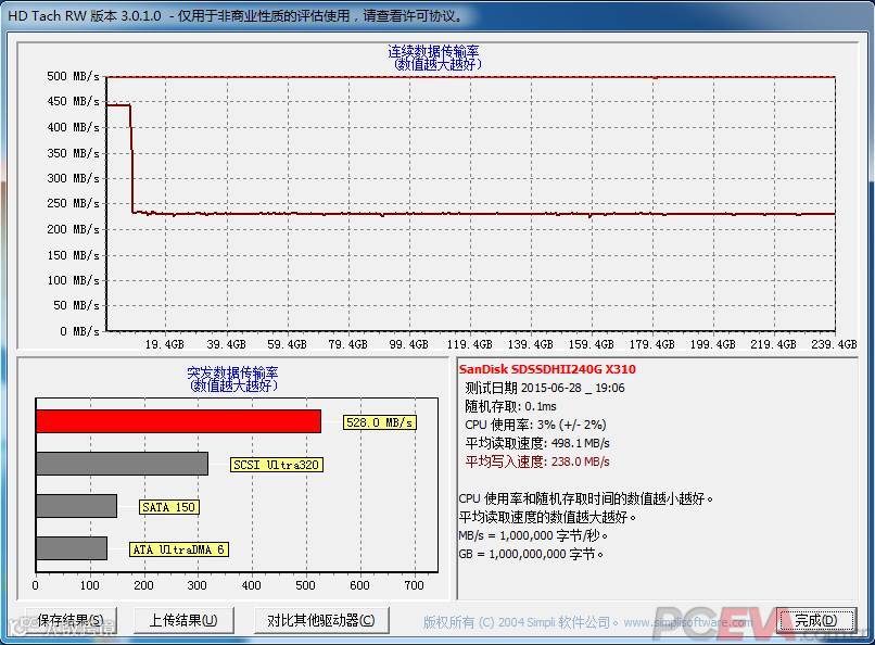 闪迪至尊高速二代Ultra II 240G在SLC Cache用尽后持续写入速度约为230MB/s:
