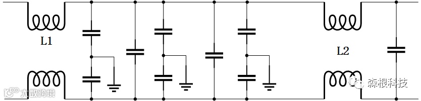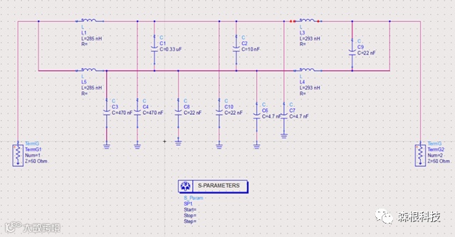 下面以森根科技常用的一种二级滤波电路拓扑作为案例进行滤波器插损仿真分享,该电路拓扑的电感采用纳米晶和铁氧体两种材料的磁芯,具体拓扑电路如Fig.1: