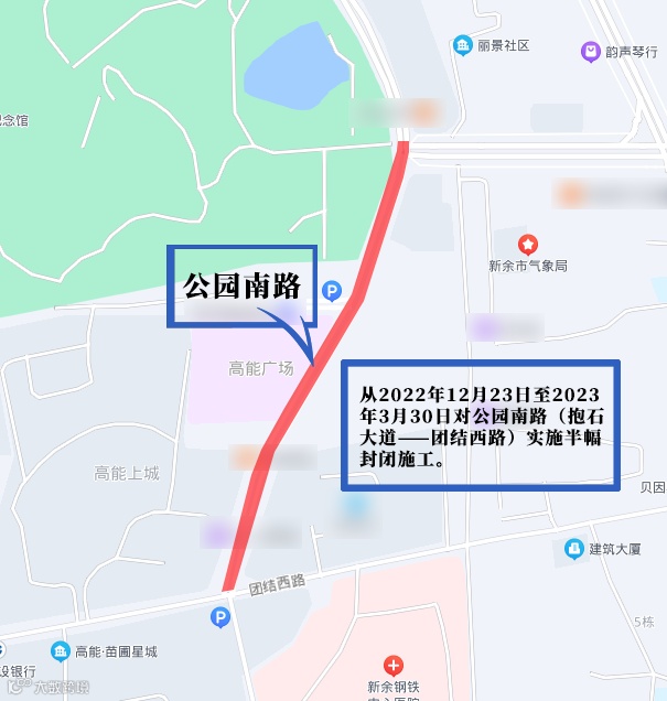 为保障新余市主城区道路改造施工期间的交通安全畅通,根据《中华人民共和国道路交通安全法》等法律法规规定,经研究决定,从2022年12月23日至2023年3月30日对公园南路(抱石大道——团结西路)实施半幅封闭施工;从2022年12月23日至2023年1月1日对茶山西路(劳动北路——长青北路)实施全封闭施工。