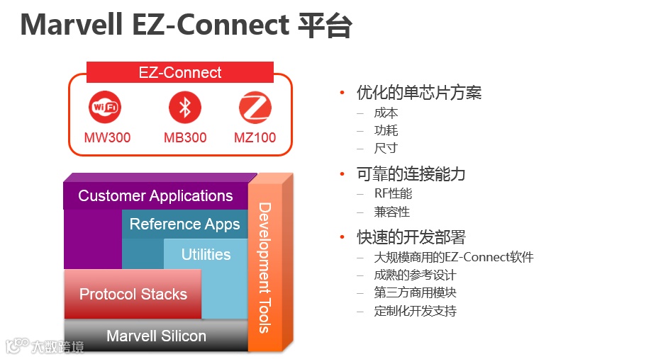在智能家居这个领域,我们推出了EZ-Connect的平台,在这个平台上,我们支持主流的三种技术:WIFI、蓝牙和ZigBee。因为Marvell在这一领域已经有了十多年的积累,所以我们是少数几家可以提供涵盖WIFI、蓝牙和ZigBee三大技术的单芯片解决方案。我们尽量在成本、功耗和尺寸上做最大优化,使其有非常好的安全性和兼容性。更进一步地,我们在这整个产品线上,提供从上到下全套的协议、开发的工具、产测的工具以及参考标准,跟云端完成对接的各种实现方案,所以客户可以拿到的是非常成熟的商业级解决方案,他只要基于EZ-Connect平台,去定制自己的协议或对接口,亦或是云端,就可以非常快速地推出自己独有的智能化的产品。