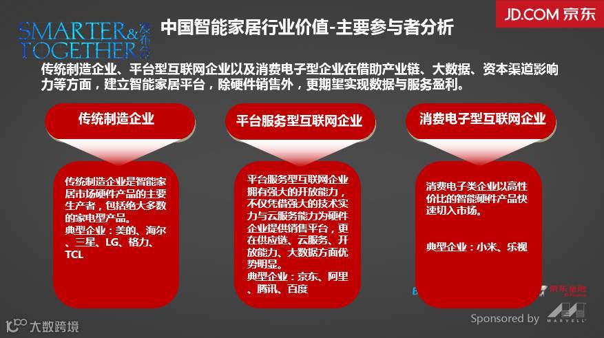 智能家居行业的参与者包括传统的家电厂商、平台服务型互联网企业(京东、腾讯、360)、消费电子行互联网企业(小米、乐视)。
