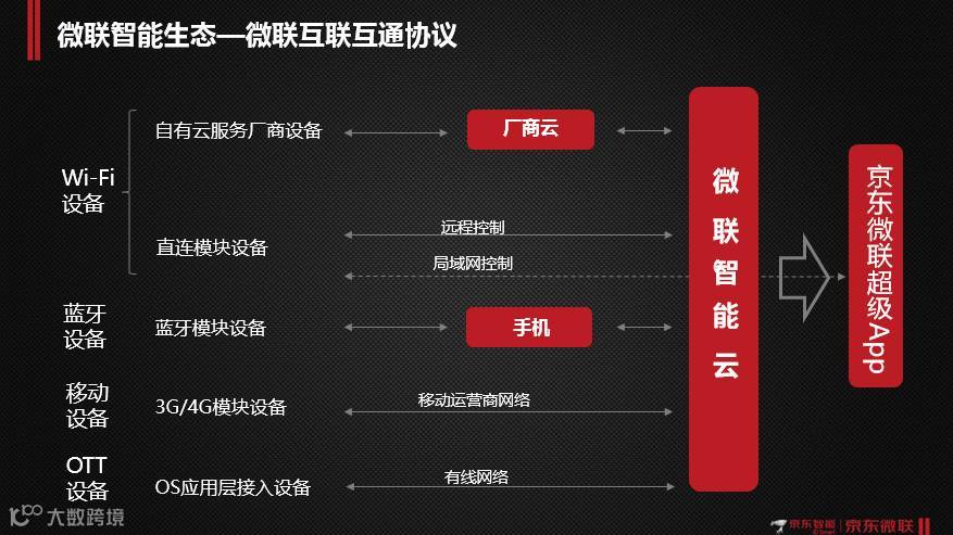 移动设备,有一些车载和穿戴设备,可以通过京东3G、4G模块设备链接到微联智能云中。还有OTT设备,可以直接进入京东的微联云。实际上还有一些其它的协议。这些技术是通过WIFI转云的方式去做连接的。