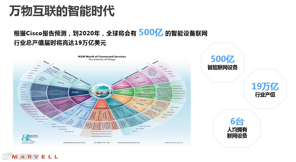 Marvell目前是全球前五的半导体厂,我们的覆盖面非常之广,包括手机芯片、网络控制芯片、存储及打印的控制芯片,和其它很多很多基于ARM架构的控制器,都是我们的产品线。我们在中国的业务大概可分为三大类,一是手机,去年我们是手机方案提供商里排名前两位的。第二在网络业务方面,我们目前在国内与华为、中兴、烽火都有很多合作,包括以太网控制芯片上都有业务。其三就是就是今天我着重介绍的物联网方向,Marvell在物联网市场上,提供各种连接的芯片,包括WiFi、蓝牙、ZigBee,还有有线的,还包括我们在家庭里面的多媒体解决方案,因为我们也是谷歌电视、Box等很多产品的主要方案提供商,甚至包括LED灯的调光芯片。