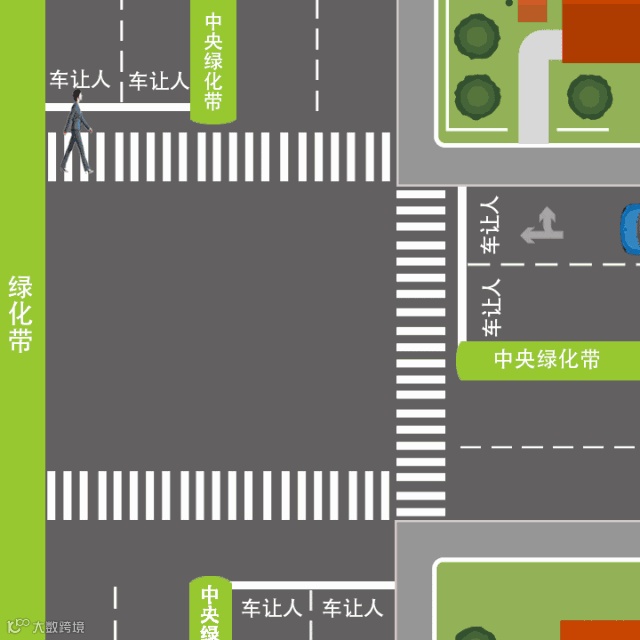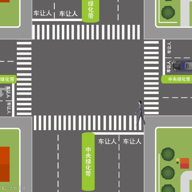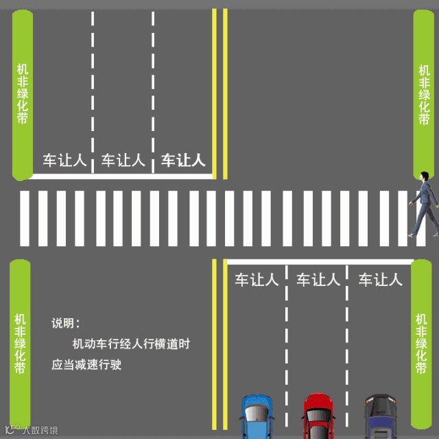 当行人行走到这个位置时,A车需要礼让停车,等待行人通过,B车可以直行通过。