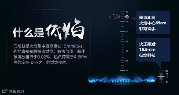 传统的灶具火焰有40-45mm,而低焰火火苗高度仅有15.5mm,外焰直接接触锅底,充分利用外焰的最高温度,把火焰热量封存在锅底。