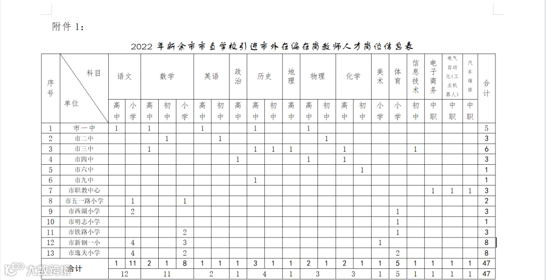 引进单位、岗位、学历、人数、专业等方面具体条件见附件1:2022年新余市市直学校引进市外在编在岗教师人才岗位信息表。