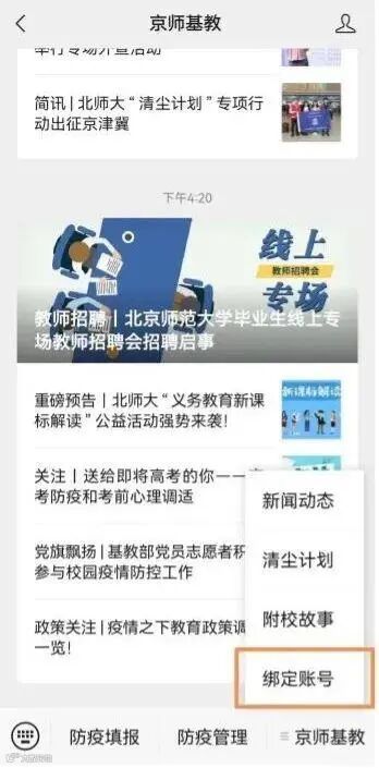 第二步:进入微信公众号,点击菜单栏“京师基教”,选择“绑定账号”,按照相关提示完成操作(如下图);