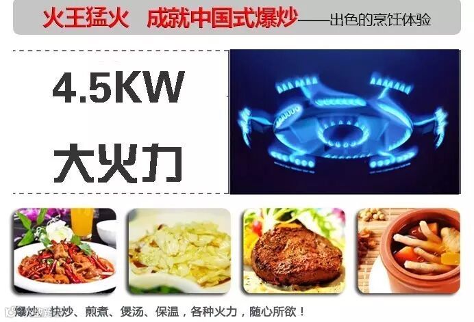低于4kw的灶具完全不能满足中餐的烹饪需求,火王的研发人员通过不断的技术研发改进产品,以涡流效应的旋焰和黄金比进气孔设计,使燃气充分燃烧,实现4.5kw的高负荷和66%的高能效。