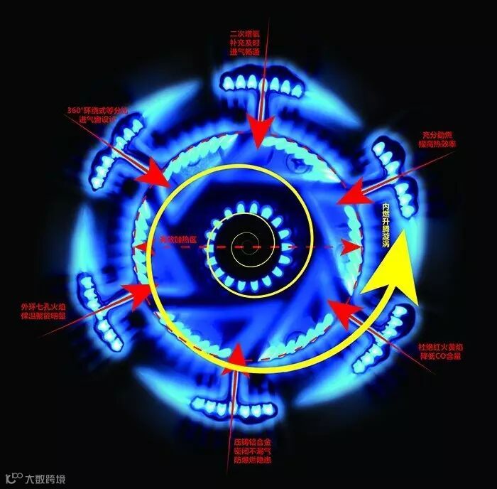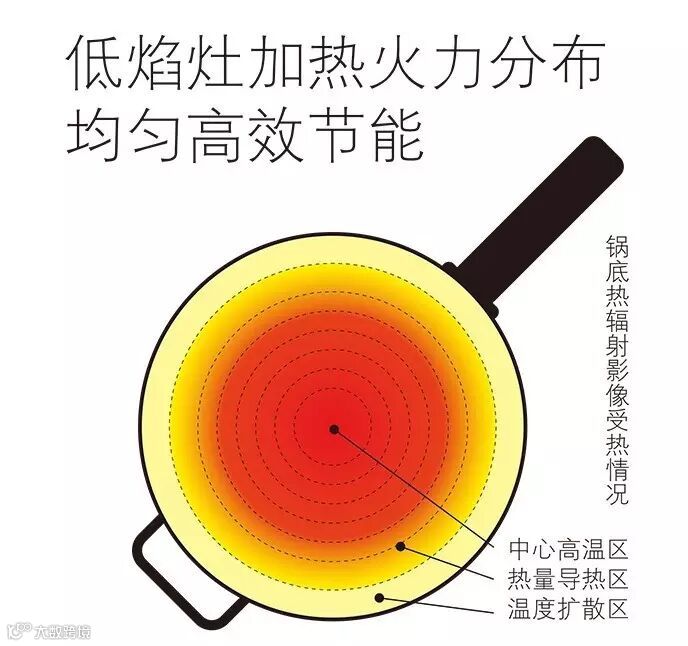 主焰在内,辅助焰在外,高温部位真正位于需要高温处,不会出现锅心冷,锅边热现象。