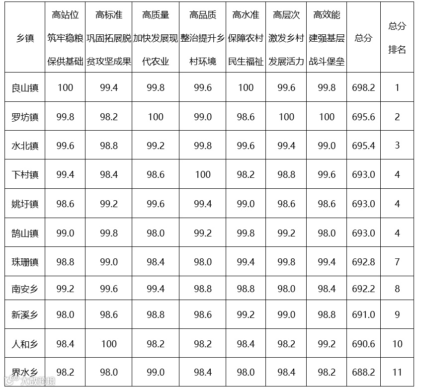 近日,渝水区委农村工作领导小组办公室根据相关文件和工作要求,会同区乡村两级重点工作各牵头单位,对全区11个涉农乡镇第三季度乡村两级重点工作任务完成情况进行了考核评分。现将考核排名情况通报如下。