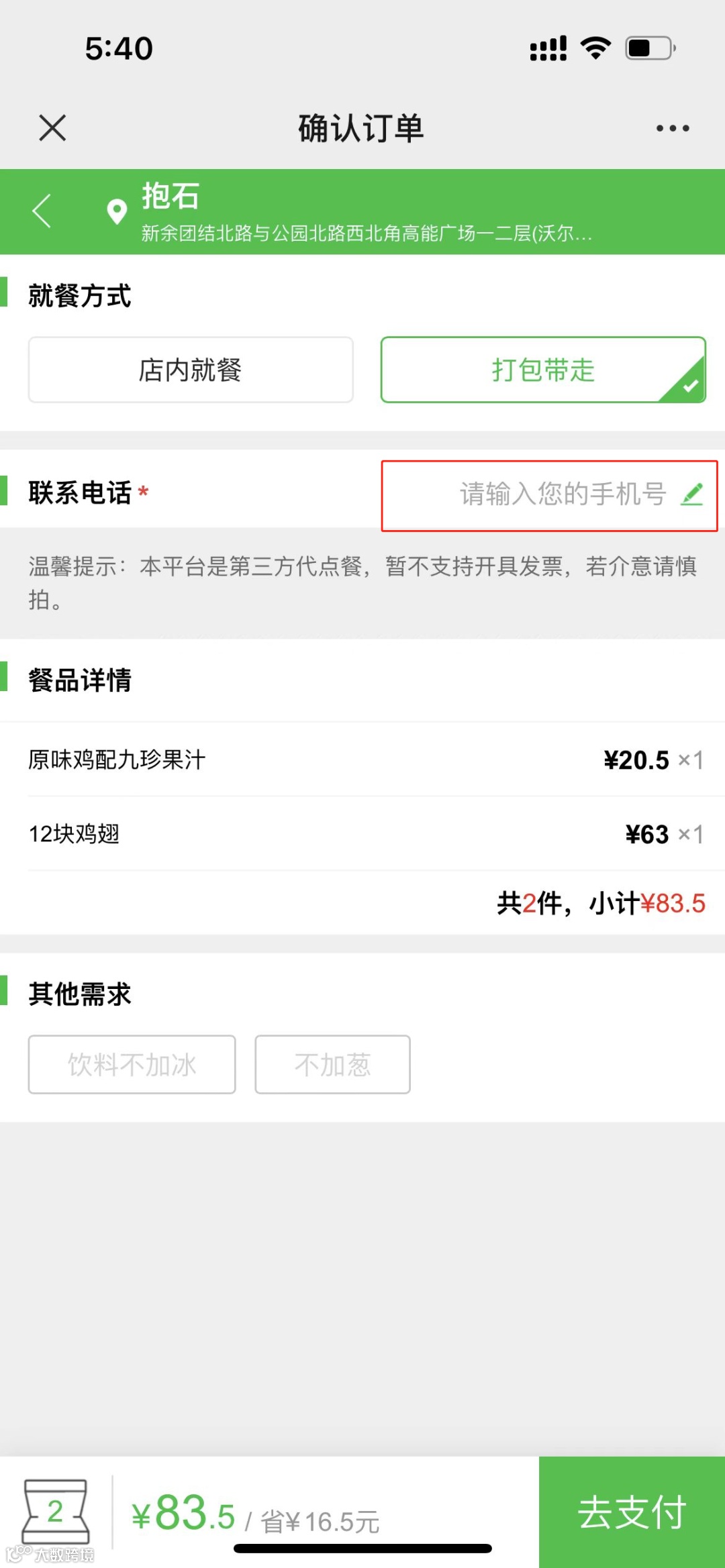 选择「店内就餐」或「打包带走」