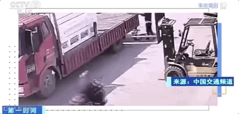 ▲驾驶人没有注意到前方的叉架起货机,一头撞在上面,幸好安全头盔保护了头部。