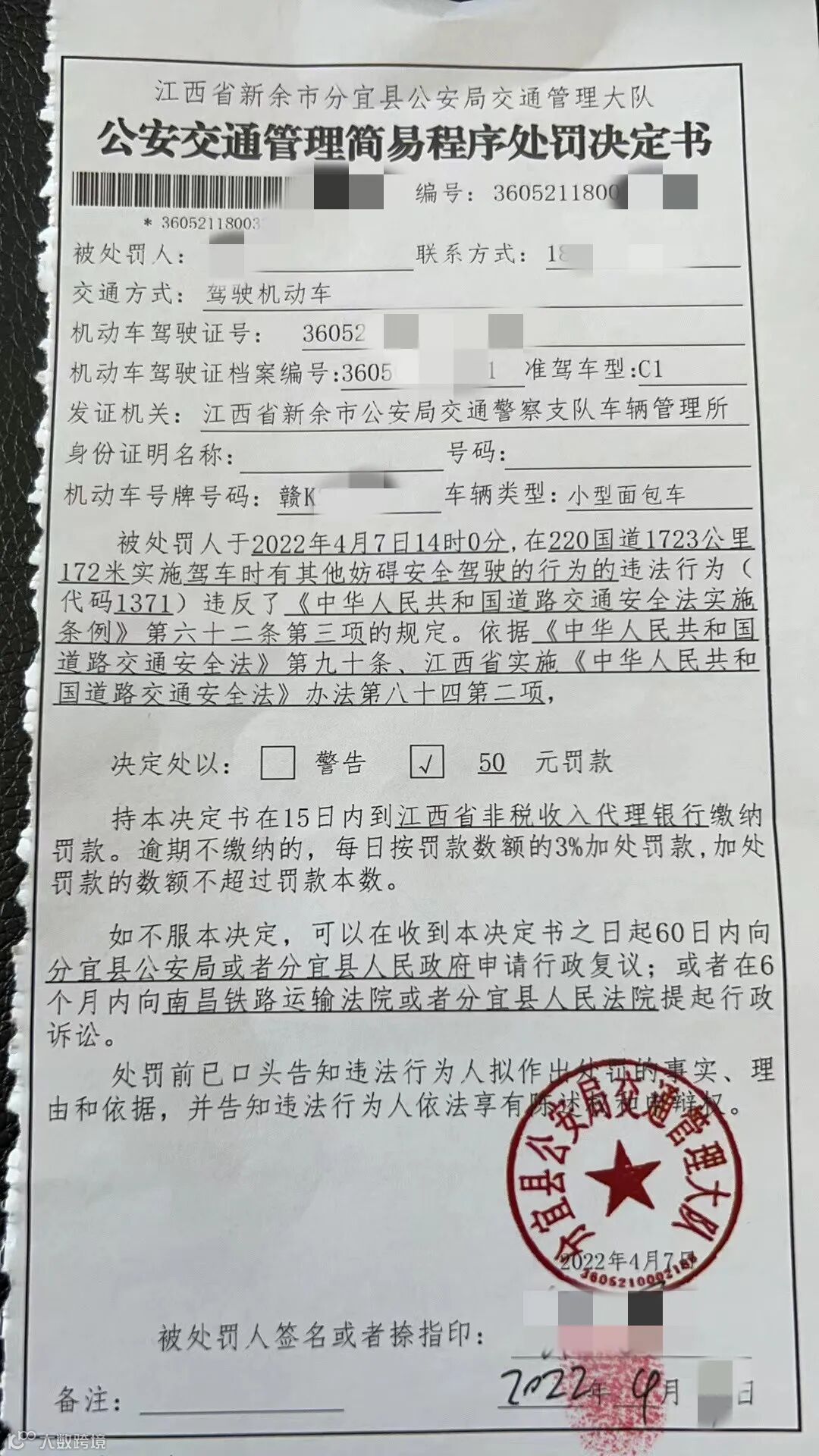 处以罚款50元、驾驶证记3分的处罚