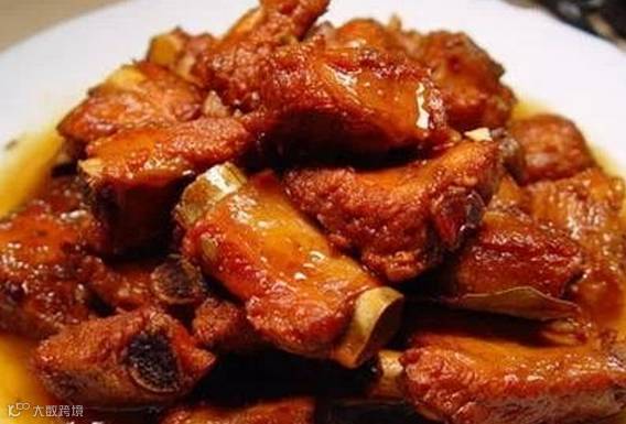 3、煮至水剩约1/3时,将桂皮,姜片,香葱,八角捞出,继续煮至排骨可轻松用筷子插入的程度,转大火,将汤汁煮至浅浅锅底的位置即可。