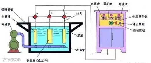 阳极氧化前要经过抛光、除油、清洗等预处理,其后要进行冲洗、着色和封闭等处理。