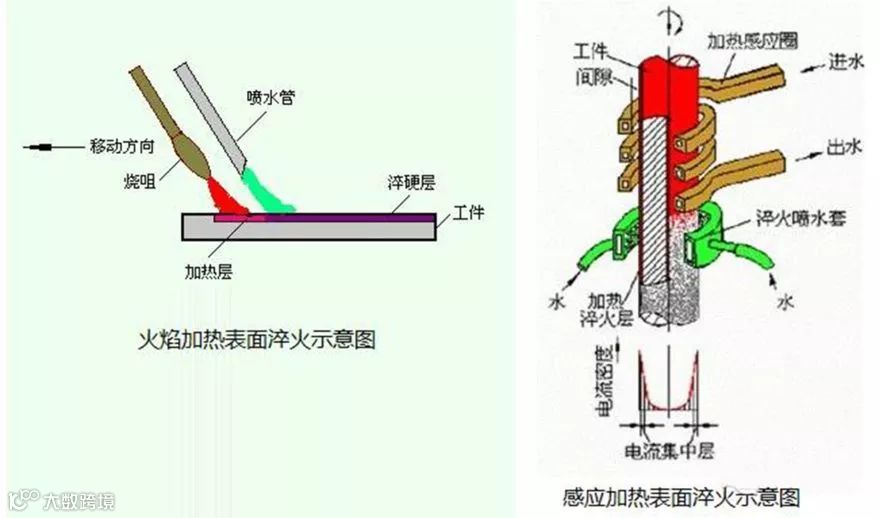 表面淬火的主要方法有火焰淬火和感应加热,常用的热源有氧乙炔或氧丙烷等火焰等。