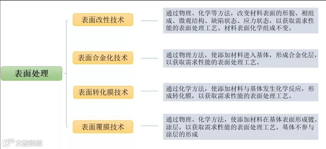 总共可以分为4大类:表面改性技术、表面合金化技术、表面转化膜技术和表面覆膜技术。