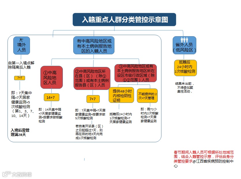 四、当前,疫情防控形势依然严峻,坚持非必需不出境,不前往中高风险地区和有阳性检测者报告的地区。外出时应保持高度警惕,严格做好个人防护,省外来(返)赣到达属地后须主动向所在社区(村组)、单位报告,24小时内主动进行核酸检测,抵赣14天内做好个人健康监测,一旦出现发热、干咳、乏力、咽痛、嗅(味)觉减退、腹泻等症状,在做好个人防护前提下,及时就近到发热门诊就诊,并主动告知近期旅居史和相关人员接触史,不建议自行购买药物服用。14天内避免参加聚集聚餐活动,避免前往人员密集、人流量大、空间密闭的场所。