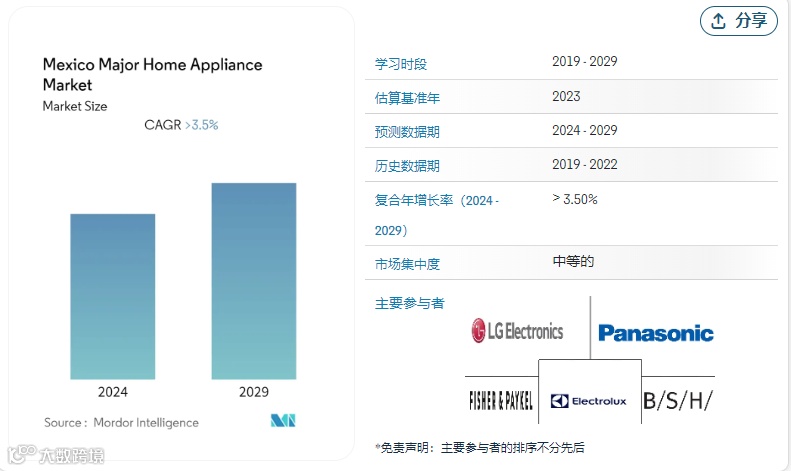 此外根据Mordor Intelligence发布的报告,墨西哥家电市场在2022年至2027年将保持增长。预计该市场每年将增长3.74% (2022-2027年CAGR)。