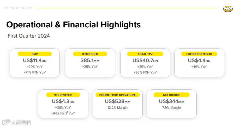近日,美客多公布了截至2024年3月31日的第一季度财务业绩。数据显示,2024年第一季度净营收同比增长36%,达到43亿美元;运营收入同比增长29%,达到5.28亿美元;净收入同比增长71%,达3.44亿美元。