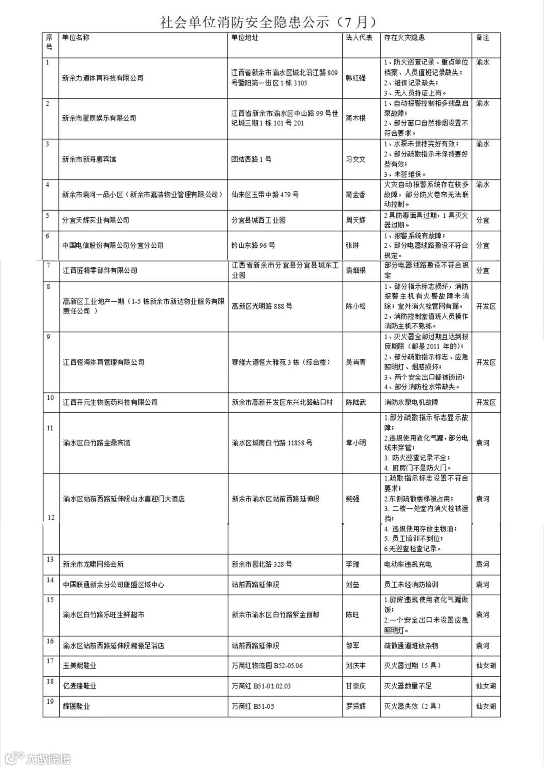 检查出存在一般火灾隐患的社会单位19家