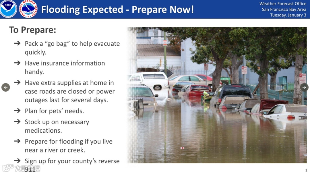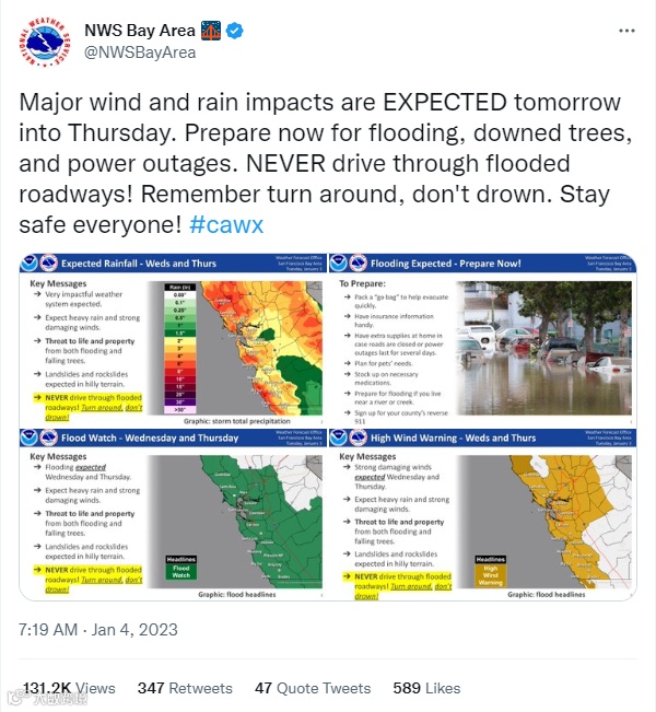旧金山湾区发推表示:预计1月5日至1月6日将受到暴风雨影响。请所在区域的居民现在就为洪水、树木倒塌和停电做好准备。