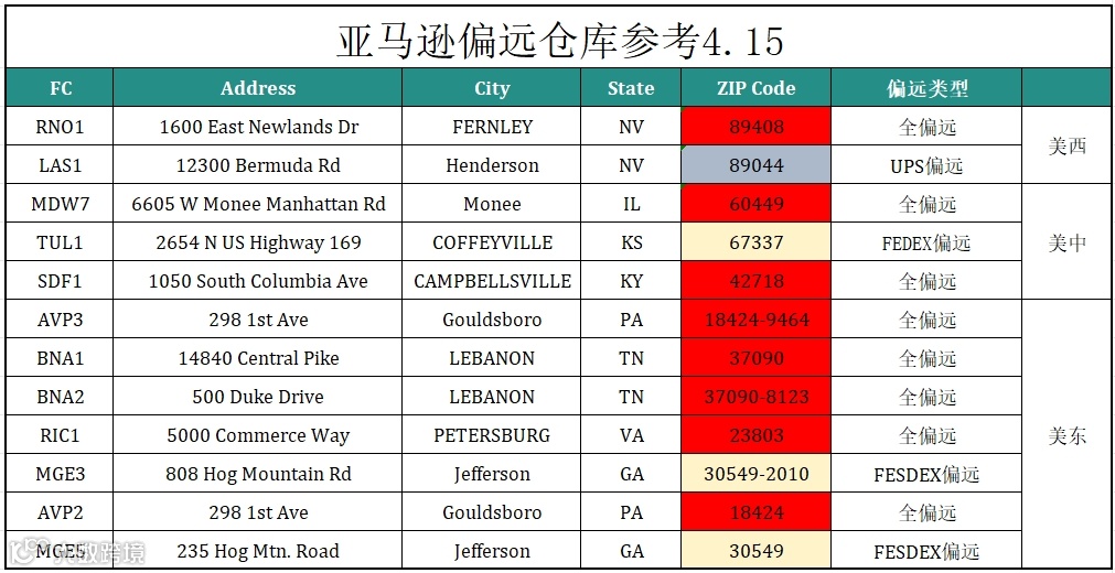 另外,TUL1(邮编67337)、MGE3(邮编30549-2010)、MGE5(邮编30549)是FedEx新划分的偏远地区仓库,卖家们同样需要注意额外的运输成本。