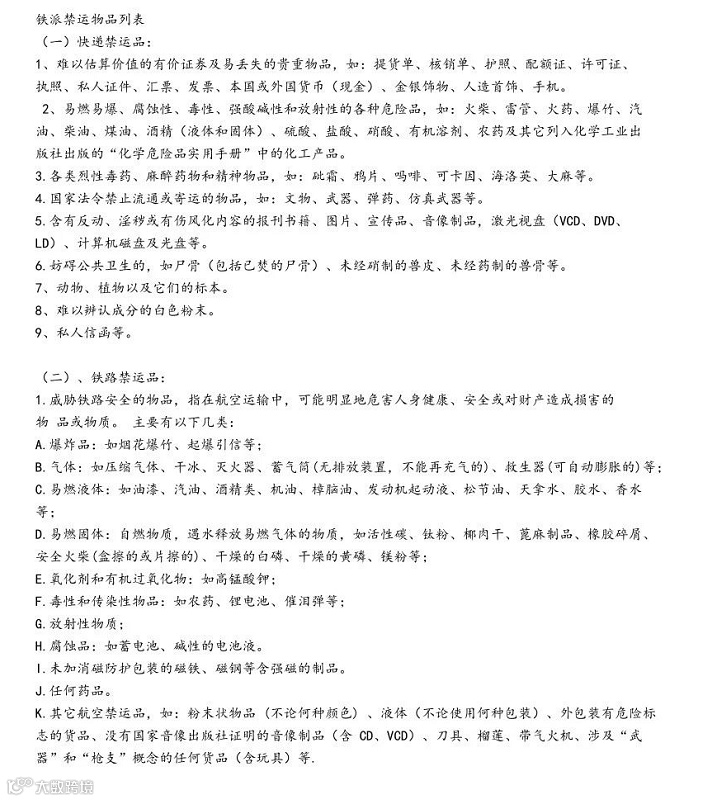 1、单件超过70KG 2、长+宽+高CM 合计超过4米 3、名牌产品无授权书 4、需要正式报关出口及清关进口包装不符合欧盟包装要求 5、产品涉及CE及WEEE 文件无法提供 6、禁止运输物品(见下图)