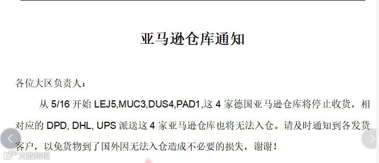 从5月16日开始,LEJ5、MUC3、DUS4、PAD1这4个德国FBA仓库将停止收货,对应的DPD、DHL、UPS派送这4个FBA仓库也无法入仓。