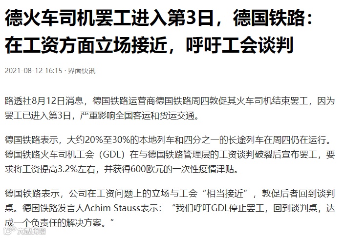 司机短缺、洪水限制卡车和铁路正常运输、德国火车司机8月9日~12日举行罢工,严重影响全国客运和货运交通,导致约300列火车班次被取消。