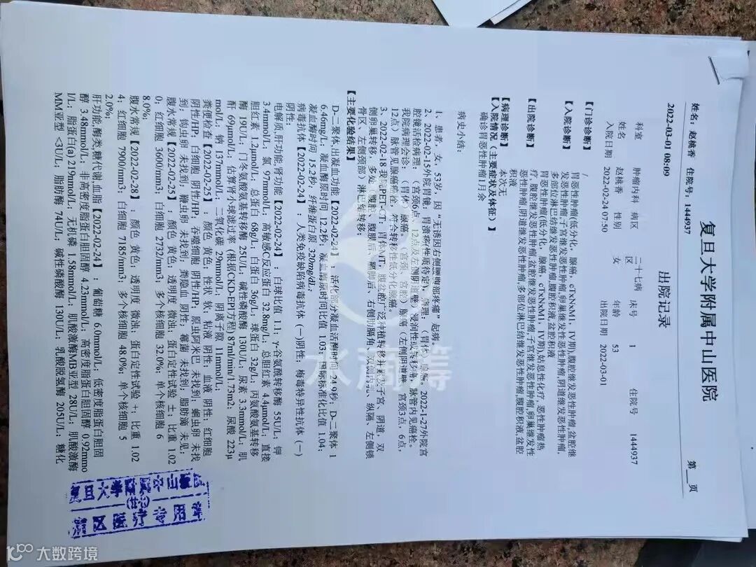 我的妻子在2020年12月20号出现腰痛,立即就去了江西抚州康民医院检查,诊断证明右侧输尿管下段梗阻,右肾积水,肾周积液,住院13天,不见好转,后来换到南昌大学附属第二医院进行再次检查复诊,住院15天进行确诊:确诊结果显示:胃恶性肿瘤,腹腔继发性肿瘤,医生告知情况不太好赶紧去大医院,我们于2022年2月16号来到中山医院进行治疗,医生告知目前不能进行手术,只能进行基因检测,每个月靶向加免疫治疗,每个月要承担上万费用,我家只是普通家庭,都是工薪渐层,目前已经承担不了后续的医疗费用,我一直都在尽力救治我的妻子,希望我的妻子能够康复。