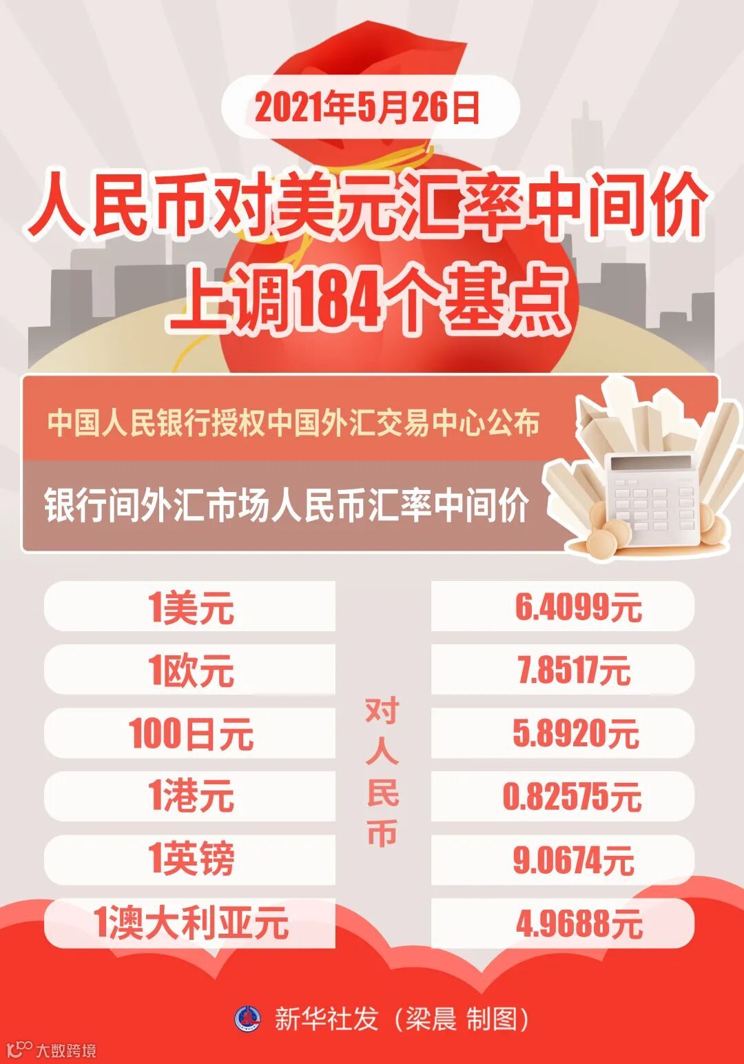 5月26日讯,人民币兑美元中间价报6.4099,上调184个基点,中间价升值至2018年6月14日以来最高。