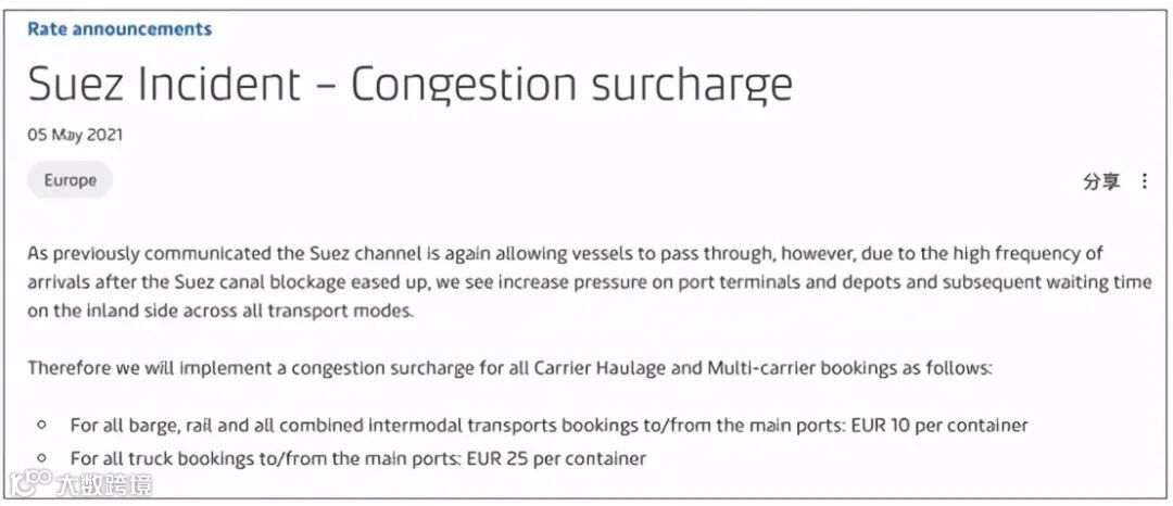 5月5日,马士基发布公告表示,对于所有往返欧洲主要港口的驳船、火车和多式联运的预订,每个集装箱收取10欧元的拥堵附加费;