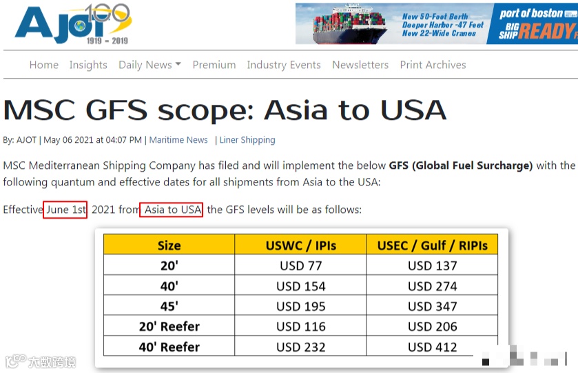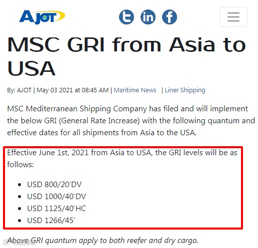 MSC自6月1日起上调亚洲-美国航线的GRI以及燃油附加费,调涨幅度见下图。