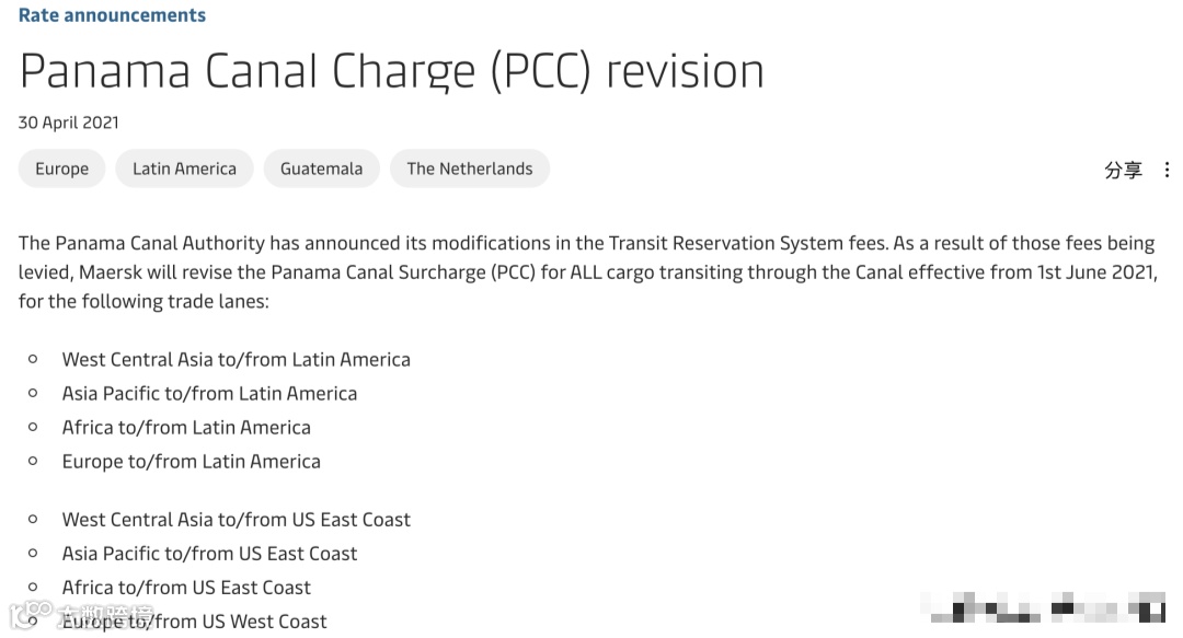 基于巴拿马运河将上调过境保留费(transit reservation fees),马士基宣布,将于6月1日起,对所有通过巴拿马运河运输的货物,上调巴拿马运河附加费(PCC)。