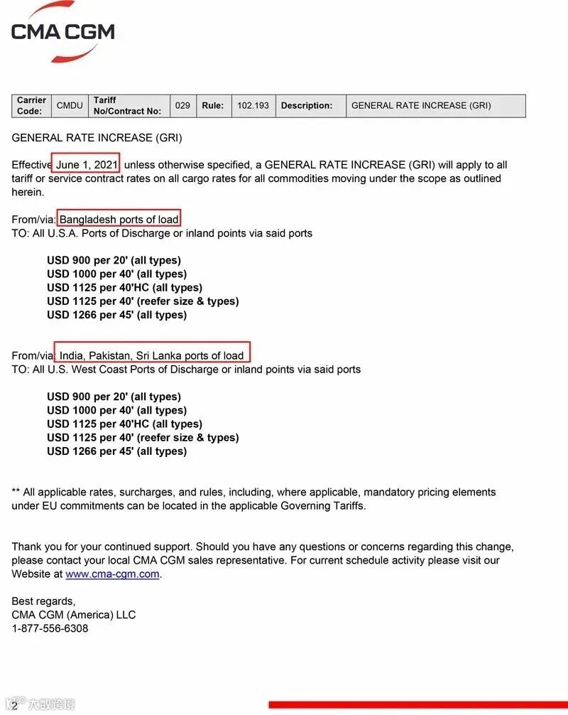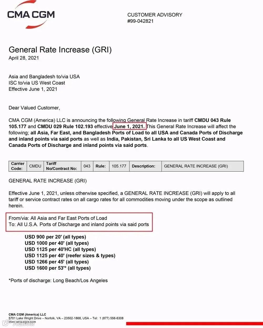 达飞6月1日起上调亚洲港口至美国、加拿大航线的GRI,最高上调1600美元/箱。