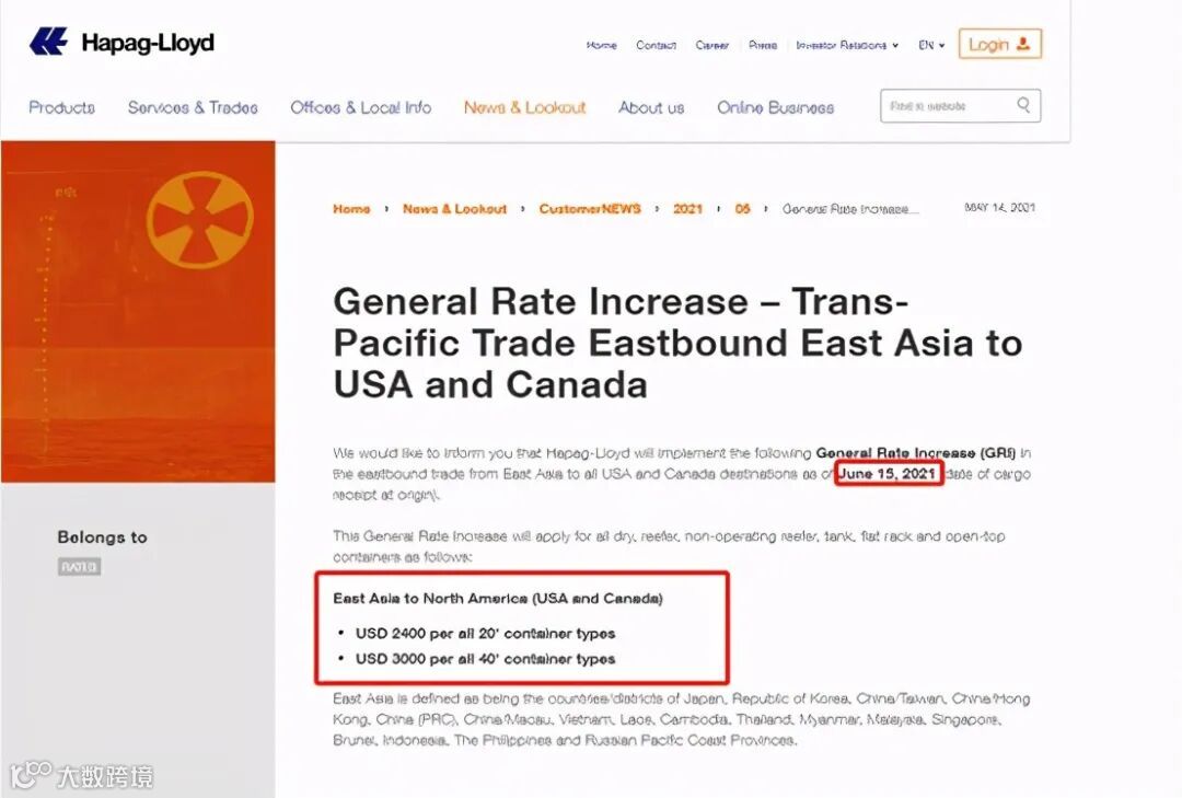 5月14日,赫伯罗特(Hapag-Lloyd)宣布,从6月15日起,对东亚地区至美国和加拿大的东行航线,上调综合费率上涨附加费(GRI)。