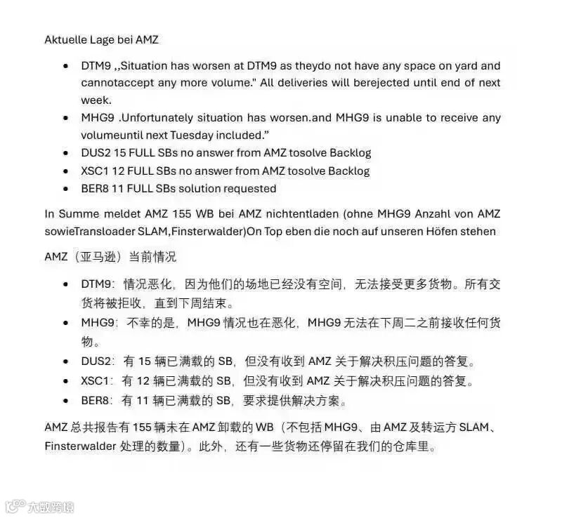 德国GLS 、UPS、DPD等快递仓库这周均爆仓卸货延迟,接到亚马逊紧急通知DTM9、MHG9 、DUS2 、XSC1、BER8等亚马逊仓库持续恶化,下周是否能恢复还未知,受此严重爆仓影响也将影响提柜清关。