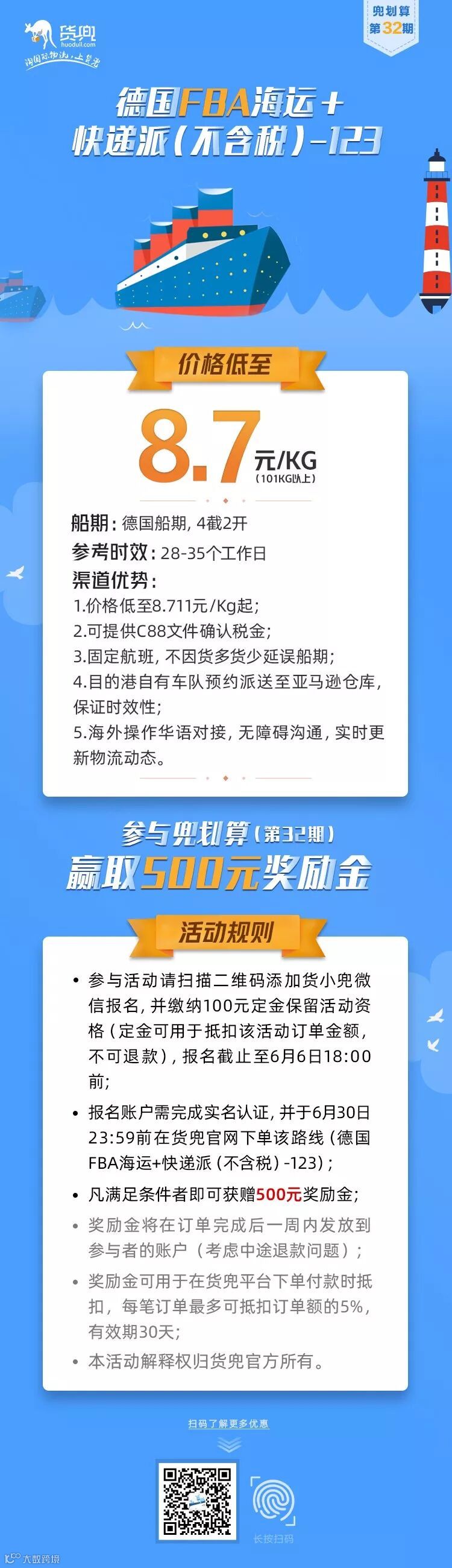 【兜划算】德国FBA空派:快递清关低至25.5元/kg,平均7天签收!