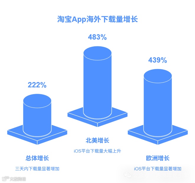 增速惊人: 4月12日淘宝App海外下载量为104,000,到了4月15日猛增至326,000,短短三天,环比暴涨222%! 🚀