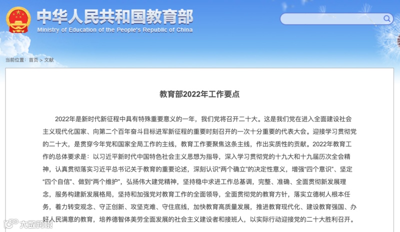 2月8日,教育部在其官网发布了2022年的工作要点,共有35项。值得关注的是,“双减”依然是教育部2022年工作中的“重中之重”,教育部特别提出要指导各地对于非学科类培训机构的区分,体现公益属性,实现常态化监管,防止出现新的野蛮生长。