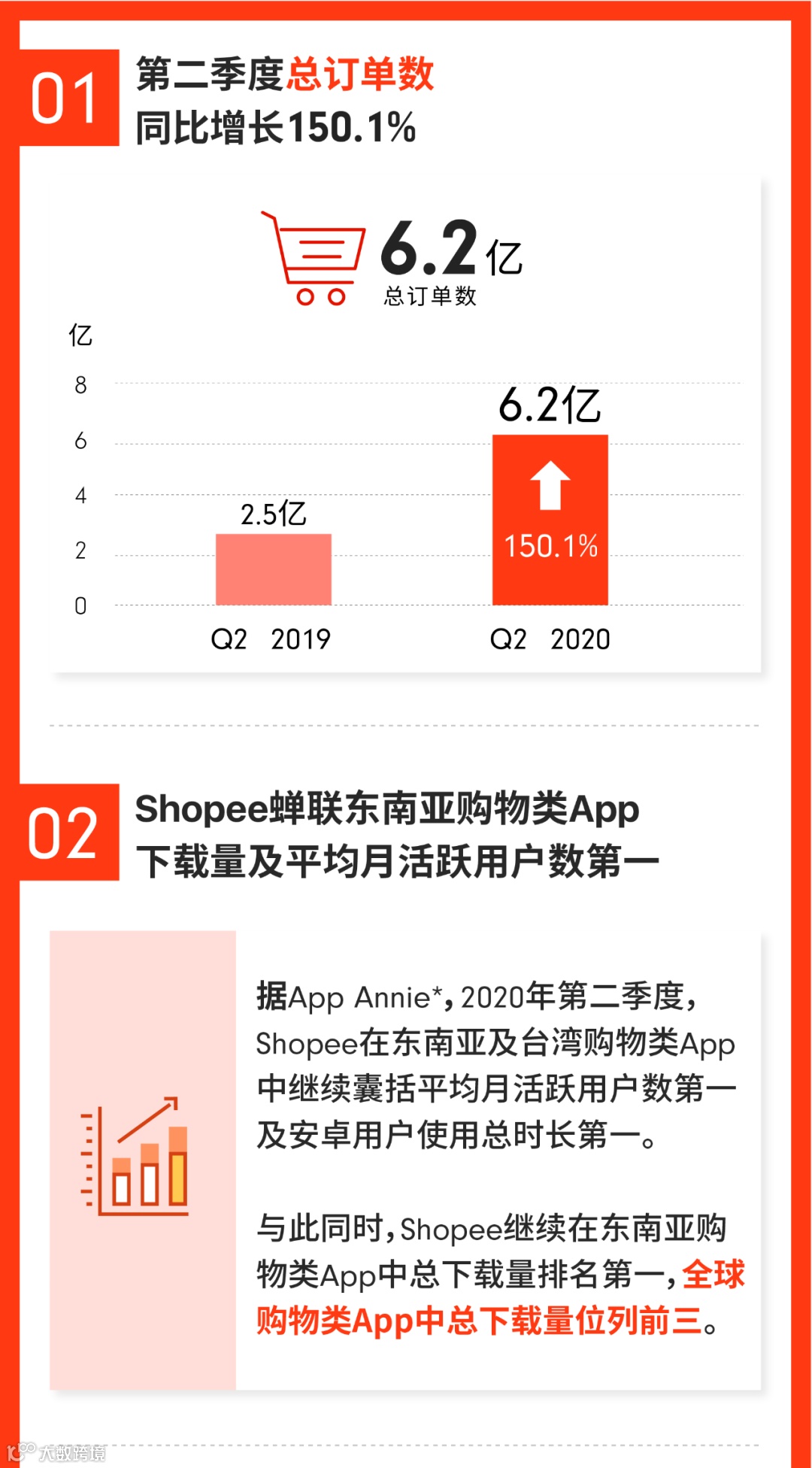 Shopee 2020年第二季度实现强劲增长,稳居东南亚与台湾市场领先地位:总订单数同比增长150.1%。