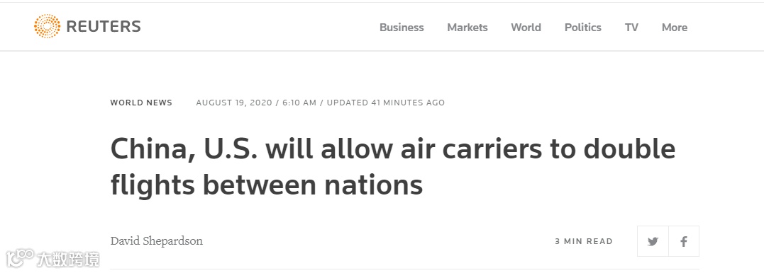路透社19日消息称,美国运输部当地时间18日表示,中美将各自允许其国内航空公司将两国间的航班数量增加一倍,增至每周8班。