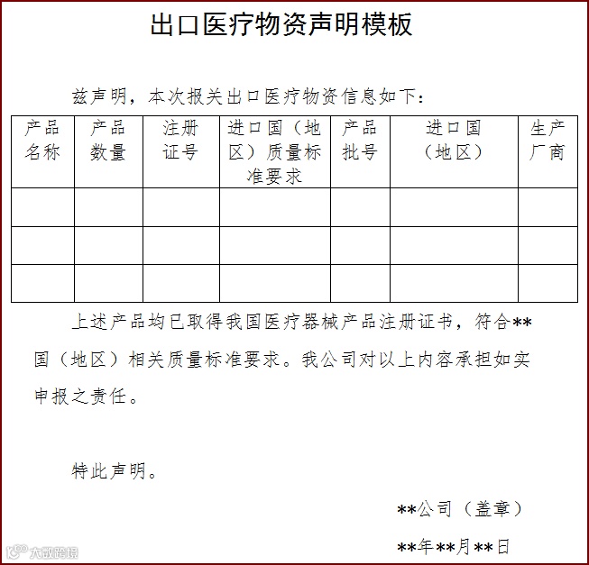 商务部,海关总署,国家药品监督管理局,发布公告,要求:自4月1日起,出口新型冠状病毒检测试剂、医用口罩、医用防护服、呼吸机、红外体温计的企业向海关报关时,须提供书面或电子声明,承诺出口产品已取得我国医疗器械产品注册证书,符合进口国(地区)的质量标准要求。海关凭药品监督管理部门批准的医疗器械产品注册证书验放。