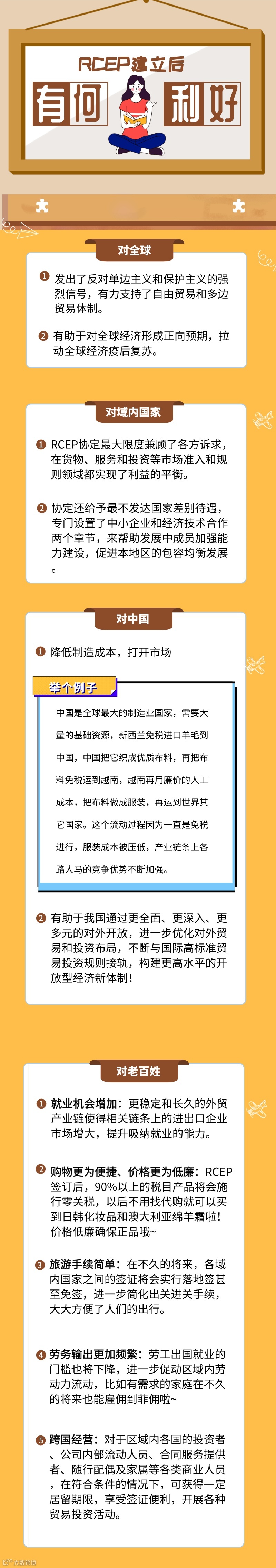 此次签署RCEP的共有15个成员国,包括东盟10国和中国、日本、韩国、澳大利亚、新西兰,总人口达22.7亿,GDP达26万亿美元,出口总额达5.2万亿美元,均占全球总量约30%。RCEP自贸区的建成,意味着全球约三分之一的经济体量将形成一体化大市场。