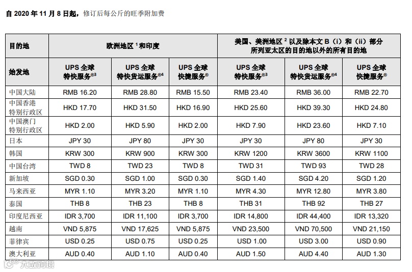 从11月8日起,往欧洲地区UPS全球特快服务附加费是16.20元每公斤;UPS全球特快货运服务附加费是28.80元每公斤;UPS全球快捷服务附加费是15.50元每公斤;相较之前欧洲地区这几项服务附加费都上涨了5.4元每公斤。