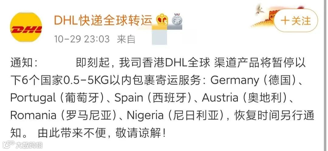 即日起UPS、DHL紧急暂停德国、葡萄牙、西班牙、奥地利、罗马尼亚、尼日利亚6个国家0.5-5KG以内包裹寄运服务,恢复时间另行通知。