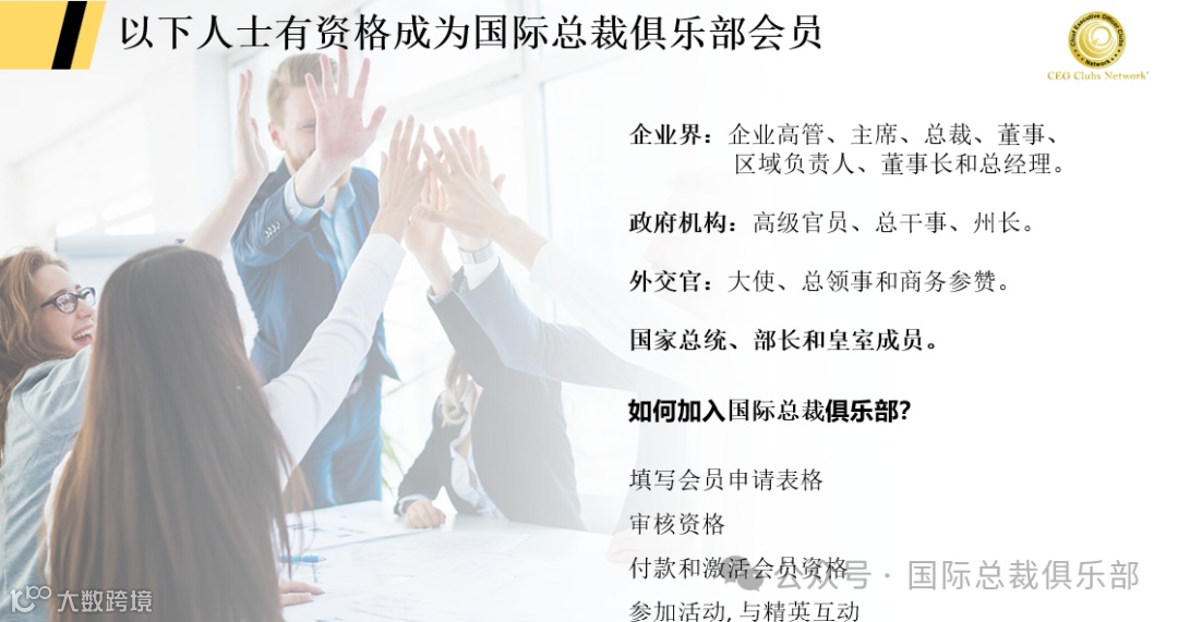 对于希望发展业务和扩大业务圈的总裁和企业高管来说,国际总裁俱乐部会员资格是必不可少的。国际总裁俱乐部的全球覆盖和专业知识将使您与和国际精英领袖以及政府机构建立合作伙伴关系。加入我们充满活力的商业组织,这个商业组织建立在信任和可靠支持的基础上。