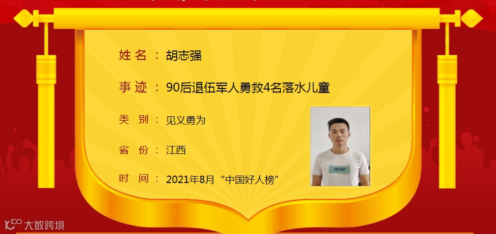 胡志强,男,1990年出生,新余市分宜县凤阳镇西廊村村民,他是一名退役军人,也是该镇民兵组织的一员。2021年6月19日,胡志强在当地生态公园散步时,看见3个小孩在水中挣扎。顾不及脱掉衣服,他就毫不犹豫跳进了水中,快速救起了3个孩子,刚上岸还没来得及喘口气,听见旁边有人在说“还有一个!”胡志强又跳入水中,在水中几经摸索,奋力把最后一位小孩扛在肩上带上了岸。确认4个小孩已无大碍,胡志强简单叮嘱后就离开了现场。