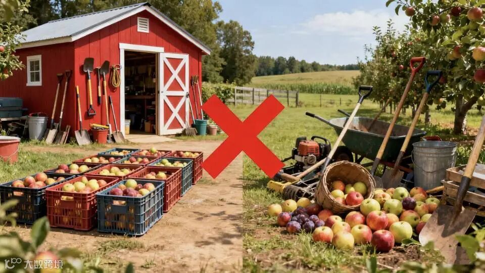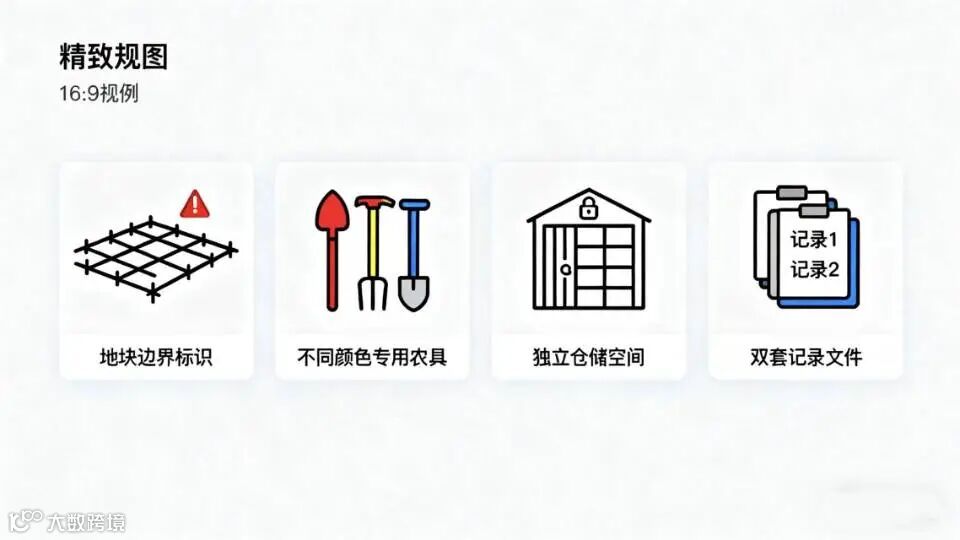 准备两套不同颜色的农具(如红色把手用于有机区,蓝色用于常规区),并分别存放在不同的工具房。 -